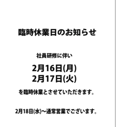 【2月16日 2月17日 社員研修に伴い臨時休業とさせて頂きますm(_)m】ご迷惑をおかけしますがよろしくお願いいたします。